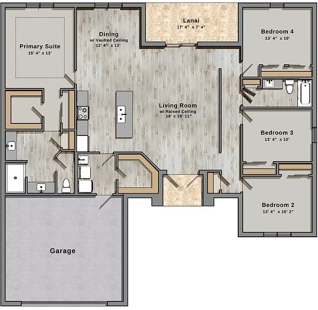 Four bedrooms, a real kitchen island, and over 2,000 square feet. Our largest plan.